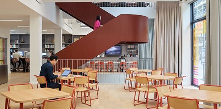 The new 12,200 sq ft studio across three floors of the 1970s building places an emphasis on creativity, flexibility, sustainability, and wellbeing. This has been achieved by adopting an activity based working model of workspace, while providing open areas for group activities and public events. Creative installations and ever-changing exhibitions create a dialogue with the surrounding community on the ground floor. The Canteen provides an informal work and social space for staff and guests at the heart of the ground floor. Flexible furniture allows the space to be configured for a variety of work, extra-curricular activities, meetings, and events. The space can easily be divided into smaller, more private dining rooms by power assisted acoustic curtains, and it is available for community use outside of working hours. The vast shopfront window graphics are designed by architect June Tong, the winning entry in an in-house competition. A series of colourful line drawn huts, they recall a Hawkins\Brown tradition of incorporating small buildings within larger ones on projects including the Gantry at Here East. The Wild, the studio’s lush green entrance foyer features the Hut, clad in an artwork of block-printed planks by artist Richard Woods. It is available for use by staff and visitors who need a little quiet time. The studio is a test bed for the practice’s ideas about modern ways of working. On the lower ground floor there are flexible hub spaces for collaboration, modelmaking and sketching; equipped with ample pin up and mobile screens, they are also ideal for design reviews. Alongside is the fully equipped model workshop, open to all staff to use. The studio has 120 bookable workspaces, eight non-bookable spaces with docks and screens, and 43 touch-down spaces across the three floors. There are meeting rooms on each floor, some of which can be divided into smaller spaces. Most staff work in the studio at least three days a week. Built in storage has been maximised; most has sliding doors faced with pinboard to display inspiring images, materials, artefacts, and work in progress. In between there are IT-equipped individual workstations for quiet concentration. Fixtures and fittings are made from a palette of natural materials – cork, timber, and linoleum. Furnishings from the previous studio have been reused and recycled wherever possible; any new furniture is British made. Registered with the Science Based Target initiative, SBTi, Hawkins\Brown is committed to reducing carbon emissions across all their studios. The new studio employs electric and non-fossil fuel systems via a green energy supplier; these include an energy saving heating, cooling and ventilation system. Solar film has been applied to the windows and manually controlled blinds reduce heat transmission and glare, respectively, on the first floor. Lighting is controlled separately by area, to suit the task. The lower ground floor has room for 40 bikes to be stored, showers, WCs, and locker facilities.