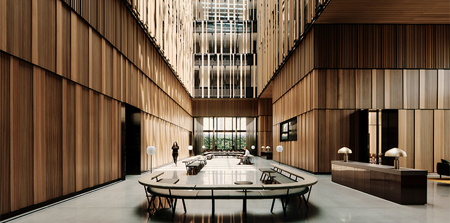 The inspiration came from Australia’s iconic landscape and embodies the essence of our vast continent. The building’s transparency manifests the inherent Australian values of welcomeness and trust, while the interior’s expansive atmosphere is representative of the vastness of the Australian landscape. At the heart of the 20,000sqm building, a large atrium serves as an orienting space displaying a powerful connection between the ground plane and the sky. This central atrium establishes a north south axial arrangement of representational spaces where every visitor is granted an equally immersive experience on entry. The main representational spaces are defined by strong materiality with Australian timber wall panels, that provide both air reticulation and sound absorption, organised around a series of textured horizontal bands that transition from rough to smooth. This mirrors the protective qualities of the bark during the eucalypt forest's cycle of growth, burn and regrowth. Intricate metallic filigree screens mediate the interplay of light and shadow in social breakout and office spaces. The security screening area provides access to the staff lifts, the consular department and a representational waiting space, allowing for the clear separation of these key flows. The representational waiting space serves as the threshold to the formal and ceremonial areas and is furnished with bespoke rugs of Aboriginal design and handcrafted Australian designed furniture. The workplace component required flexibility for 13 different government agencies leading to a U-shaped plan and side core arrangement to ensure efficiency and flexibility of departments over time. A key element of the design was the staff hub;, a series of breakout spaces vertically linked by a feature stair within the controlled access zone, encouraging staff to move easily between departments and social spaces. This environment is an open, warm, light-filled space to naturally gather and engender workplace cohesion. A state-of-the-art gallery space is dedicated to displaying the embassy’s permanent collection as well as changing exhibition of artworks, sculptures and audio-visual displays. The works emphasise Australia’s artistic excellence, rich Indigenous heritage and depict the stories of vibrant diaspora communities, showcasing our creative culture to the world. A collaboration with the DIA identified a number of leading local furniture designers. Incorporating both contemporary and historically significant designs, the selection celebrates the essence of Australian design. Crafted using sustainable materials and finishes the pieces embody a future-forward aesthetic and informality. The selection and commissioning process for the embassy artworks was guided by the Government's cultural policy of drawing inspiration from Australia's cultural infrastructure, prioritising First Nations representation, creating a space for diverse voices, and ensuring a meaningful and engaging experience for all visitors. Sustainability plays a vital role with LEED Gold Certification earned through innovative design.