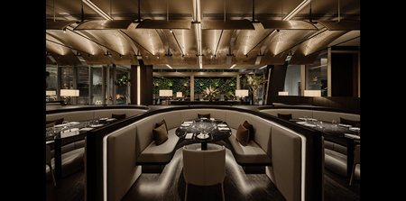 Situated at basement level, the restaurant benefits from natural sunlight through an open void above, creating a bright and inviting atmosphere. A small terrace with a green wall enhances the outdoor dining experience. The seating arrangement includes flexible options near the facade, a fixed U-shaped sofa banquet in the middle, and customized tall sofa seating for intimacy and optimal layout.An escalator leads customers to the restaurant, flanked by a wall adorned with customized champagne-colored metal mesh featuring the Lawry’s logo. At the basement level, guests are greeted by a small water basin with plants and the venue’s logo. A red gradient glass box separates the entrance from the main space. Opposite the reception, an art piece by RooMoo, titled “No Making Without Few Breaking,” features 140 artistic paper bowls symbolizing the reunion of fractured porcelain, representing a new beginning for Lawry’s in Shanghai.