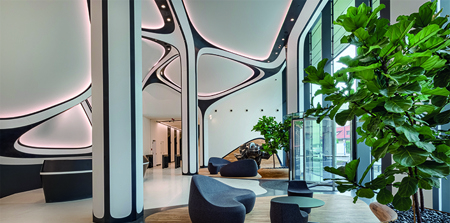 One of the most remarkable aspects of this project is the use of Barrisol Lumière Color® 3D solutions. These solutions not only provide a unique and modern aesthetic but also offer significant functional advantages. For instance, Barrisol stretch ceilings contribute to optimal acoustics, reducing background noise and promoting a serene and productive working environment. Additionally, the use of RGB LEDs in the Barrisol Lumière Color® solution allows for varying lighting ambiances, enhancing the visual experience and contributing to energy savings. The Masaryčka lobby project is a model of environmentally friendly design. Barrisol® sheets used in the project are 100% recyclable and have a low carbon footprint. The architects at Zaha Hadid Architecture chose Barrisol® materials to help achieve LEED Platinum certification, ensuring the highest standards of sustainable construction. Innovation is at the heart of the Masaryčka project. The Barrisol® materials are used creatively to form complex shapes and unique patterns on the ceiling and walls, giving the lobby a distinctive visual identity. This innovative approach transforms the lobby into a visual landmark within the building. The project is designed with the users' needs in mind. Special relaxation areas have been created to encourage informal interaction and collaboration, enhancing the overall user experience. The Masaryčka lobby is an outstanding example of interior workspace design. It combines aesthetics, functionality, sustainability, and innovation to create an inspiring and enjoyable communal space. This architectural work demonstrates our commitment to designing workspaces that enhance the well-being of users while addressing today's environmental challenges. This project not only showcases our expertise in innovative interior design but also sets a benchmark for future projects in sustainable architecture.