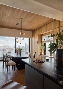he client wanted to create a natural residence in the city, where the home could be more natural and take full advantage of the landscape. * Create the environment with water Because the mansion is located near the river, the designer wanted to create a "water house" in city. We use the form of water and mutated water to make design expression; * Hide the plateau The designer projected the experience and sentiment of this journey into the design, extracting colors from the passionate national culture of the plateau, such as the sparrow blue lacquer painting depicting the Himalayan mountains in the living room, the photography works capturing the sky meadow scene in Nali area, and the Tibetan red throw pillows. * Material aesthetics The designer tried many materials in this project, and then combined the traditional craft to make the expression. nder the living room window is an original side table designed specifically for this space, made of ebony that has been buried in the ground for thousands of years in the Southwest and then washed out by rain. The designers did not remove the mottling that the material had developed over the years, but kept these cracks like the veins of leaves, and the table was also presented in the shape of leaves. We do not think that the cracking of wood is a flaw, but the beauty presented by the vitality, which is also the multiple possibilities that wood can bring to the design. * View into the house Designers make full use of the view under the window, because under the window is to go close to nature. * Environmental protection, historical continuity Most of the materials used by designers are natural materials to reduce the impact on the environment; And many of the purchased furniture is recycled medieval products, which not only continues the beauty, but also practices the concept of environmental protection and sustainability, and continues the historical story of each object.