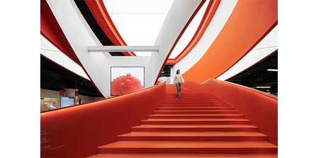 The atrium facing the museum entrance is its most distinct feature. An iconic double-spiral red stair serves as the visual core of the museum. One half of the double-spiral staircase serves as the “display stair” featuring LED screens showing posters and videos, and the other half leads people to the upper floor.The space leading to the restrooms has been transformed into a dramatic red tunnel, which naturally forms a triangular glass showcase at the end, serving not only as a viewing window but also as further exhibition space.
