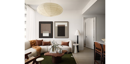 An exclusive element in the bedroom is a custom nook that offers an unobtrusive place for work or study, optimizing the space and attracting a variety of tenants.To make the apartment feel more personalized, Fogarty Finger worked with local artists and makers to create custom furniture and art pieces. Adding unique design touches to the furnishings, art, and accessories helps bring each room to life.