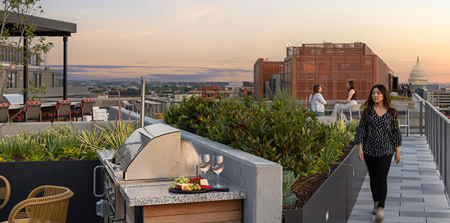 A Fitwel-certified residential community, connection with the outdoors is integral to both Market House and The Rigby. Spaces are designed to celebrate views of the NoMa neighborhood and the distinctly DC skyline, and residents have access to the amenities offered in both buildings, with the two buildings connected through a private courtyard. Pet-friendly, The Rigby and Market House outdoor environments range from intimate fireside lounges and cozy dining nooks to an outdoor yoga studio.