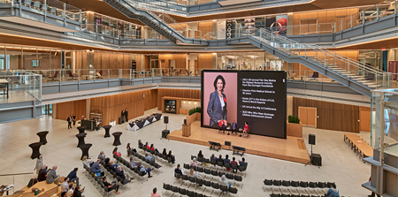 The design of the building doesn’t separate researchers into their own labs, but instead co-locates them in fully equipped, highly flexible lab space, near promising startups and on-site organizations that offer seed capital and support.The building’s four-storey central atrium, with its crisscrossing staircases and bridges with glass rails and glass walls along labs, is all about the exchange of ideas and putting science on display as the main event, not a secret behind closed doors. Occupants can see the science, on the big scale that the institutions bring, and in the small labs of the young start-ups.
