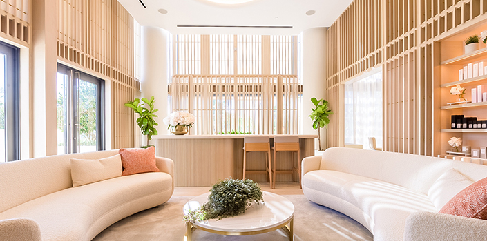 Key design elements include soft curving lines, vertical wood slatted screens, and natural textures such as white oak, Jerusalem limestone, and lush greenery. This soft approach is juxtaposed against iconic Chanel- inspired vanities and furnishings. The space layout features seven treatment rooms including a serene couple’s suite, vaulted steam rooms, private manicure, and pedicure stations, individual women’s and men’s lounge and locker rooms, a grand lobby, and an invigorating outdoor terrace connecting to Miami's sought after spectacular views.